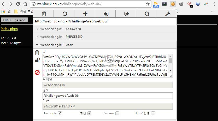 소스코드에서 확인한 대로 최초 접근 시 쿠키 값이 설정되어 있지 않으므로 'guest', '123qwe'를 base64 인코딩하여 쿠키 값으로 설정됐다.