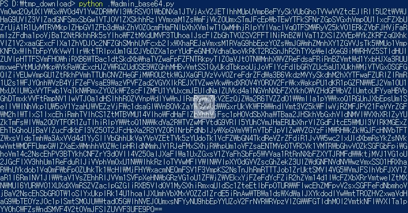 아이디와 패스워드가 동일하므로 'admin' 문자열을 총 20회 base64 인코딩 및 숫자를 치환하는 파이썬 스크립트를 작성한다.