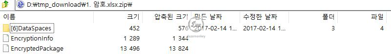 시트가 보호된 엑셀 문서는 상기 그림과 같은 구조로 되어 있고, 패스워드가 설정된 엑셀 문서(엑셀 문서를 열 때, 패스워드 요구)는 Encryption 파일이 존재한다.