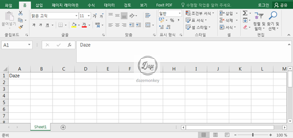 실습을 위해 새로운 엑셀 문서를 열어 A1 셀에 "Daze" 문자열을 작성한다.