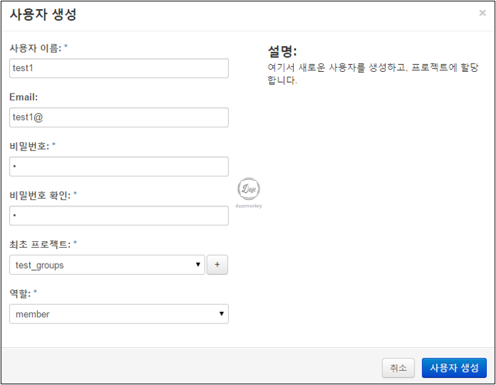 먼저 사용자를 추가하기 전에 사용자 그룹을 생성해야 되는데, 대시보드에서 사용자 그룹을 프로젝트라 하고 콘솔에서 사용자 그룹을 테넌트라고 한다.