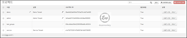 대시보드에서 admin 계정으로 로그인 -> 관리자 -> Identity 패널 -> 프로젝트 -> 프로젝트 생성을 클릭해서 원하는 프로젝트 이름을 입력 후 프로젝트 생성을 클릭한다.