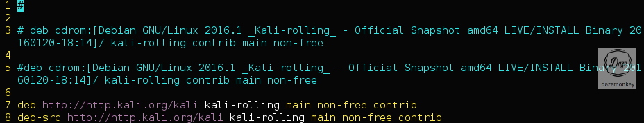 칼리 리눅스 저장소(레퍼지토리)에서 롤링 버전의 경로를 확인하고, /etc/apt/sources.list 파일에 붙여넣는다.
