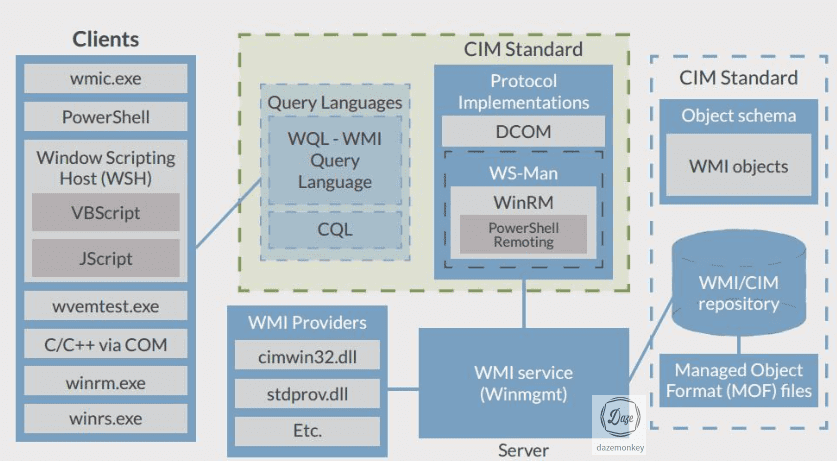 다양한 표준 중 WMI(Windows Management Instrumentation)는 윈도우의 리소스에 접근하여 여러가지 설정을 구성할 수 있고, 다양한 부분을 관리할 수 있다.