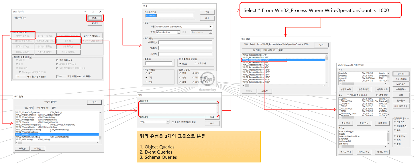 WMI 데이터에 접근하는 방법은 여러가지가 있지만 대부분 WMI 쿼리를 사용한다. 간단하게 테스트를 해볼 수 있는 도구는 윈도우에 기본적으로 설치되어 있는 wbemtest.exe이다.