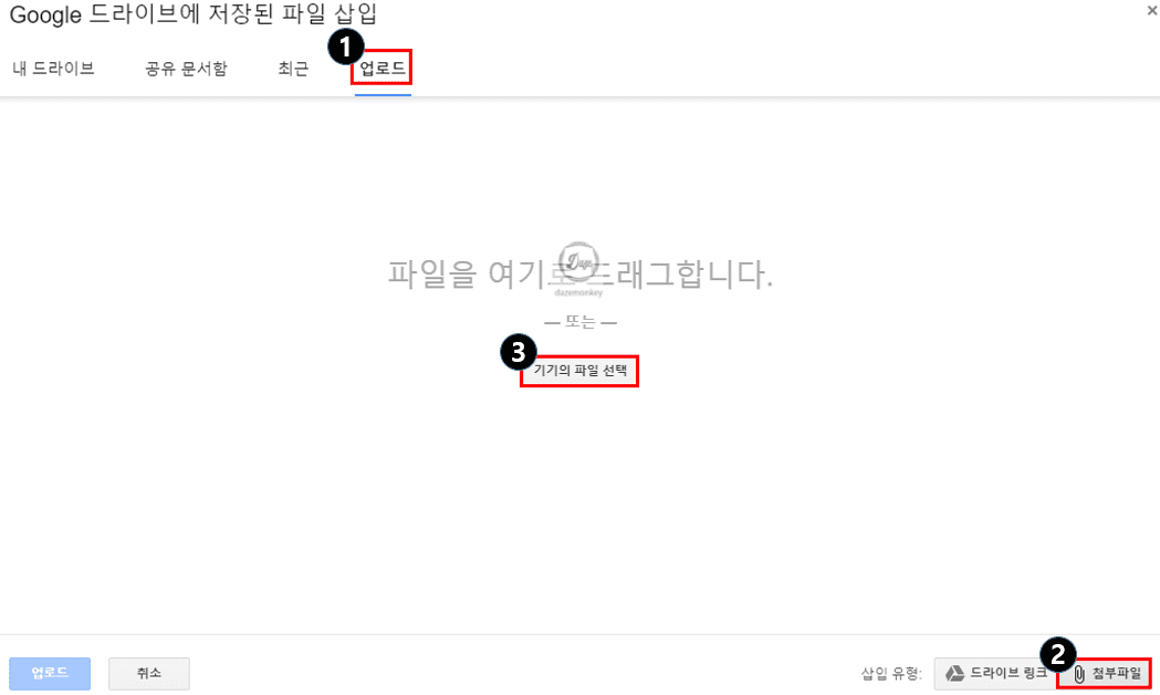 Google 드라이브에 저장된 파일 삽입 팝업 창이 뜨는데 업로드 > 첨부파일 > 기기의 파일 선택 버튼을 클릭해서 첨부할 파일을 선택한다.